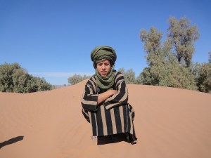 Unlike much of Morocco, this area of the country around the town of Tagounite seems very conservative. The call to prayer fills the air five times a day, the women all wear headscarves or full-on burkas, and men don the traditional outfit of the indigenous North African Berber people. That consists of an ankle-length robe called jilaba and a colorful turban, which helps keep the wind and sand at bay. Some of the turbans include up to nine meters of fabric! Here’s my new friend Kamal in his favorite desert man outfit: