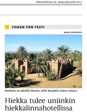 Yesterday my first article that I reported from the African continent was published in Finland. It’s a hotel review of sorts that I wrote for Helsingin Sanomat, Finland’s largest newspaper (that I modestly like to call “our New York Times“). I contribute pretty frequently for the travel section of HS, often about New York but sometimes about other places around the world as well.